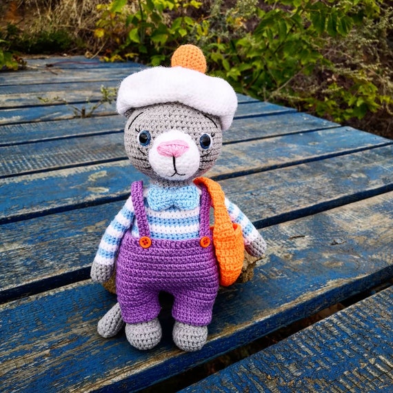 Cat Gray Toy Amigurumi Knitted Toy In Overalls Crochet Etsy