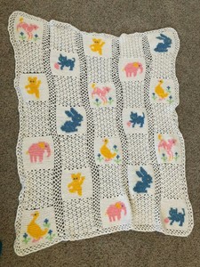 Handmade Yellow Crochet Knit Blanket W Cross Stitch Bear Elephant Duck Cat Bunny Ebay