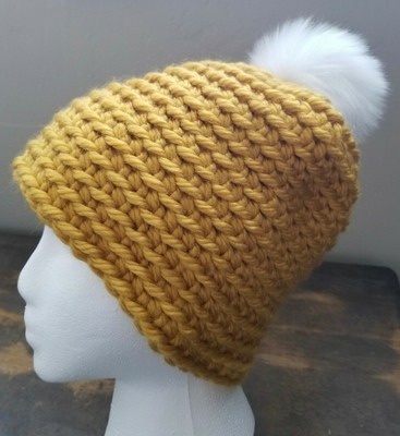 Women Crochet Chunky Beanie Hat Mustard Yellow W White Fur Pom Pom New Handmade Ebay